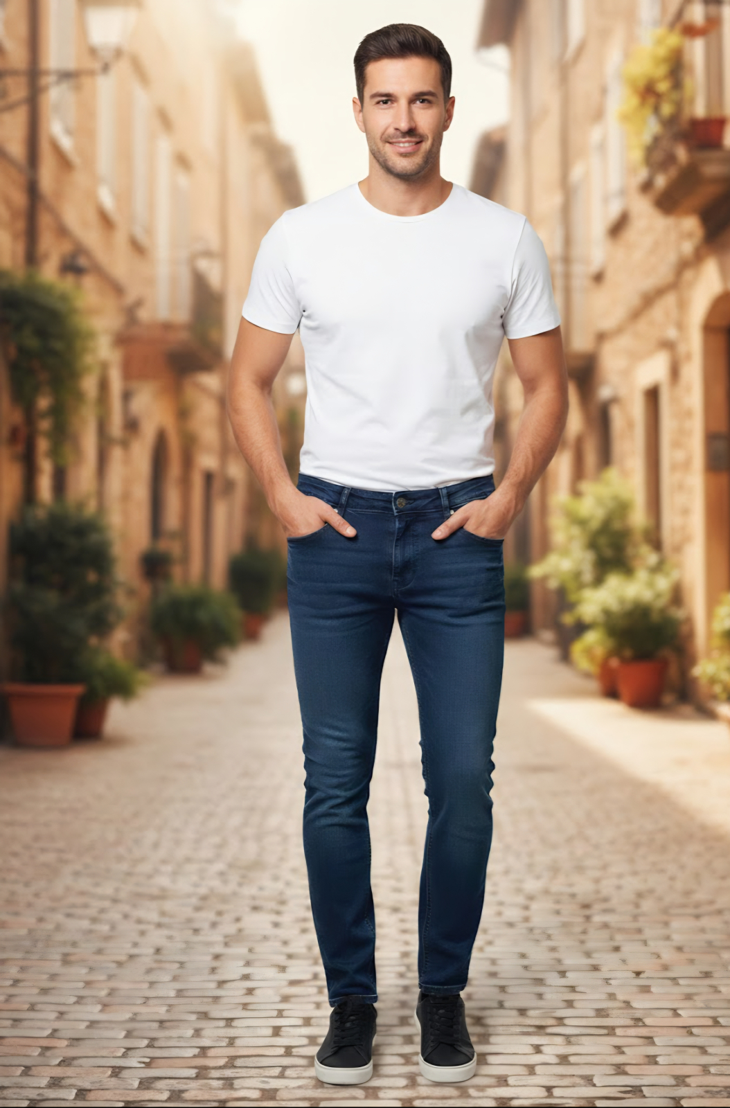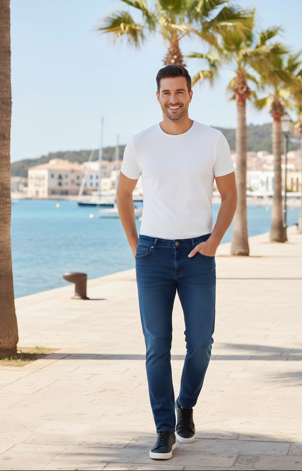 Look-ul "Clean Casual" (ca în imagine): Combină-i cu un tricou alb imaculat, bine croit, și sneakers negri sau albi din piele. Este o ținută minimalistă care nu dă greș niciodată.