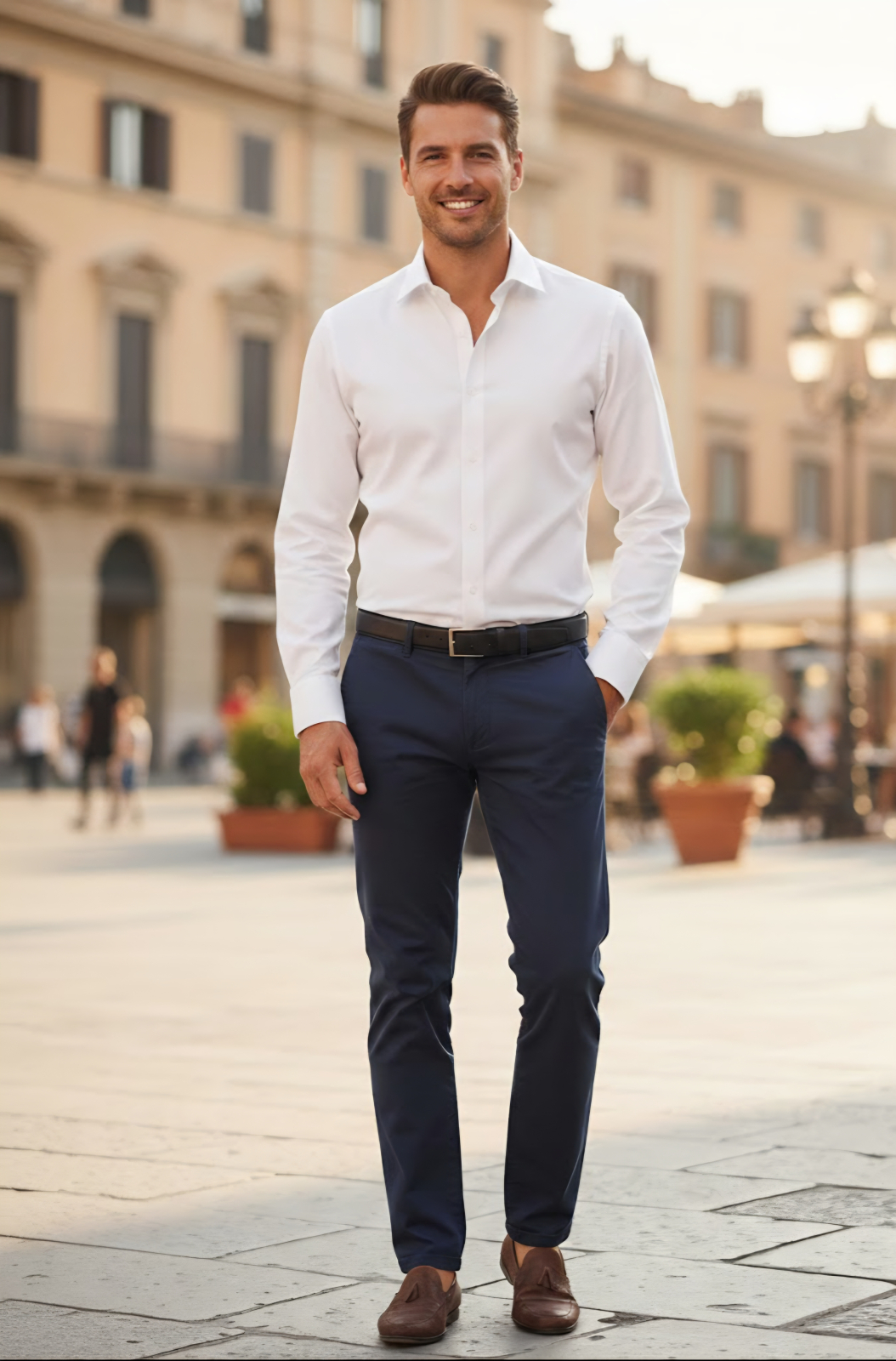 Smart-Casual Relaxat: Pentru un look de weekend sau o ieșire în oraș, lasă primii doi nasturi deschiși și combin-o cu jeanși indigo sau pantaloni Chinos în nuanțe de bej sau kaki.