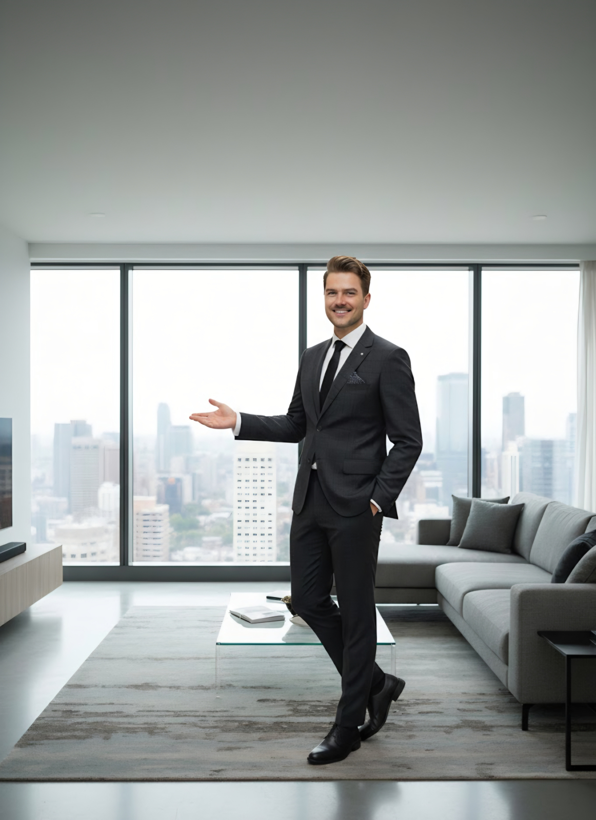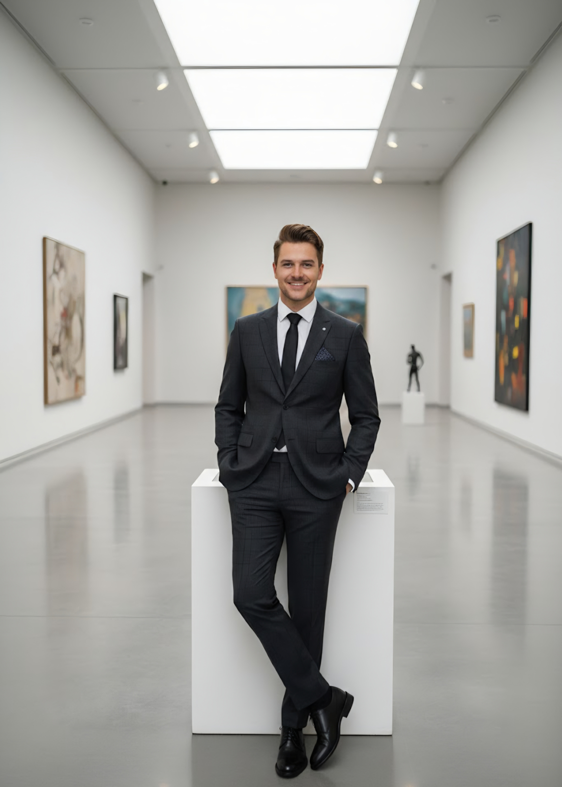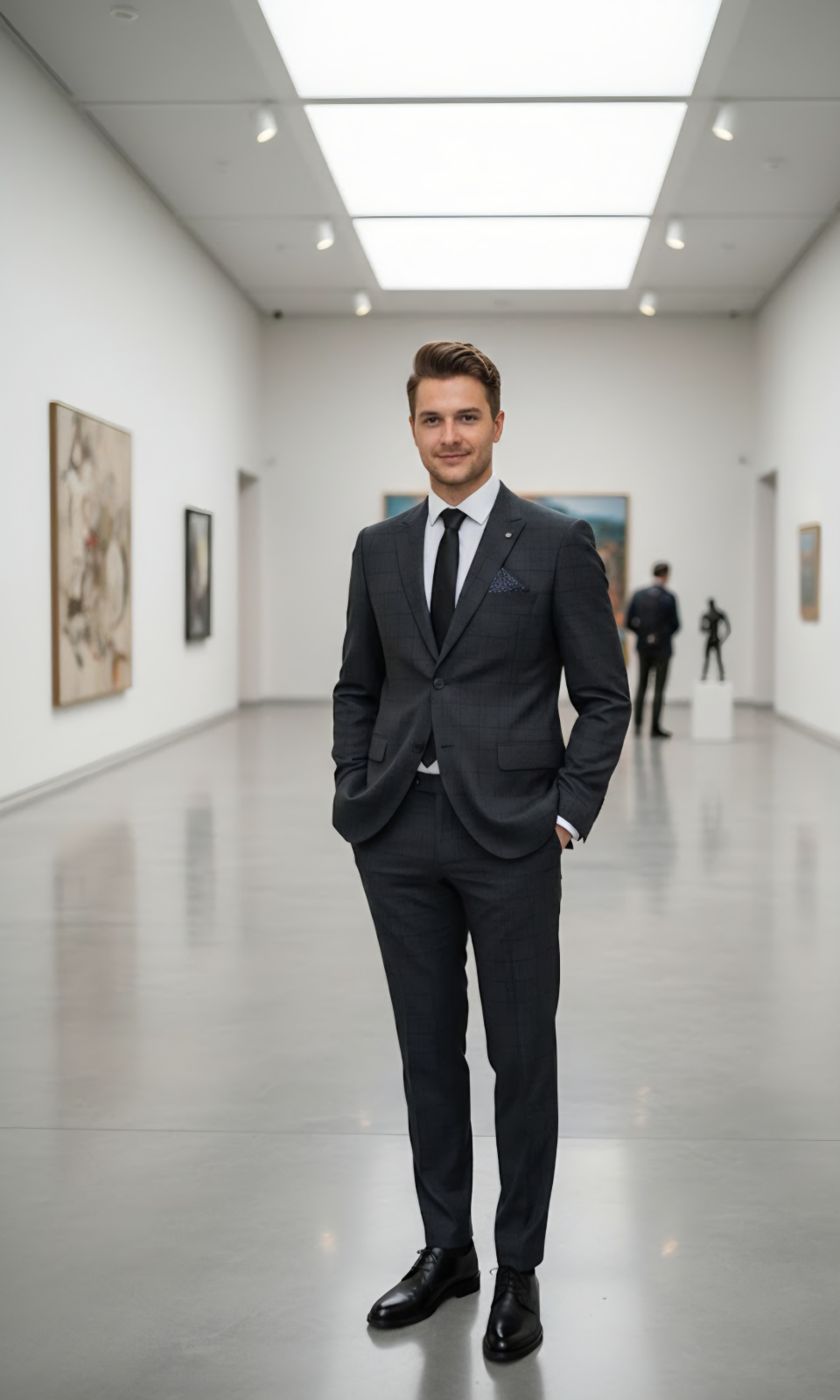 Costumul din imagine este o piesă vestimentară care comunică un profesionalism modern, fiind ales special pentru a se integra într-un mediu minimalist și sofisticat.