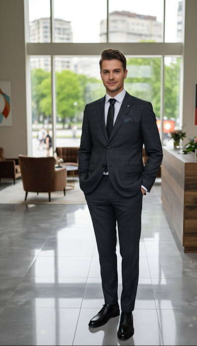 Costumul din imagine este o piesă vestimentară care comunică un profesionalism modern, fiind ales special pentru a se integra într-un mediu minimalist și sofisticat.
