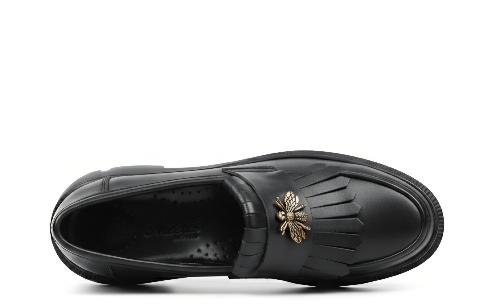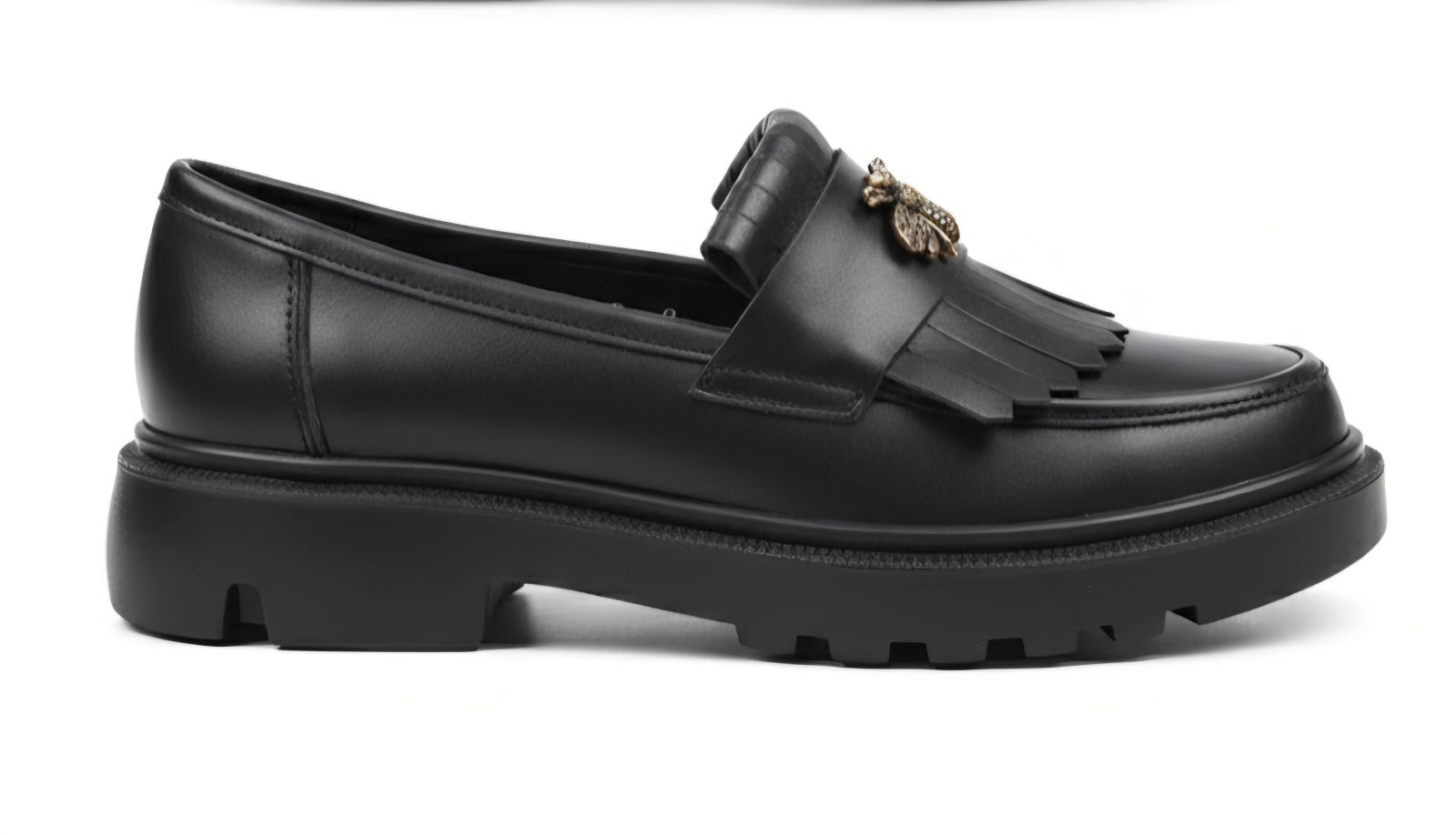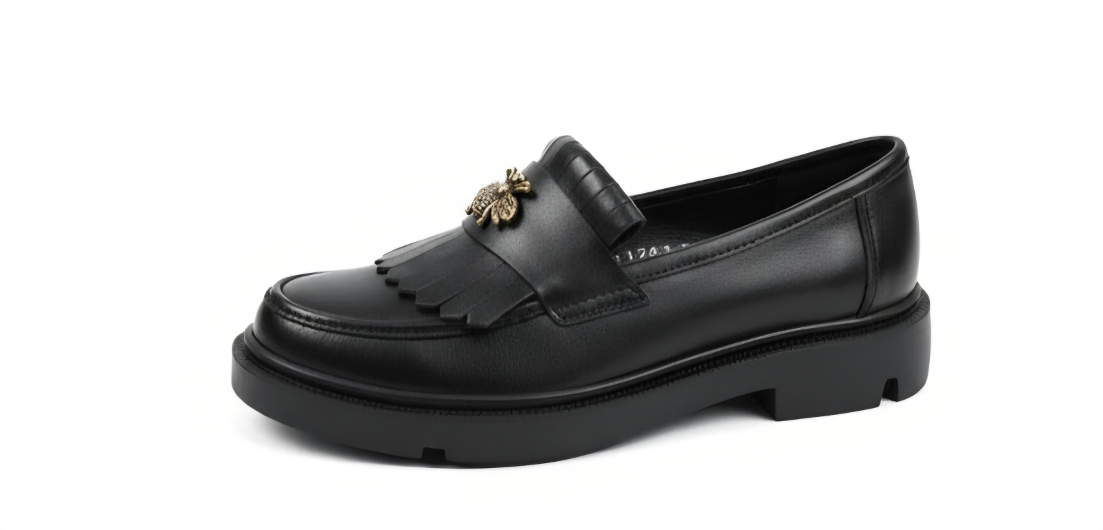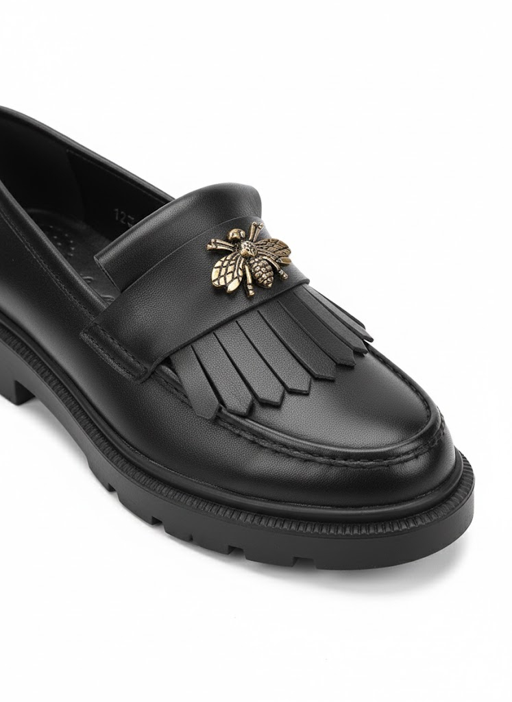 Elemente Distinctive: Designul este îmbogățit de o baretă decorată cu franjuri și un accesoriu metalic tip albină bronz-auriu, adăugând o notă de lux și personalitate fiecărui pas.