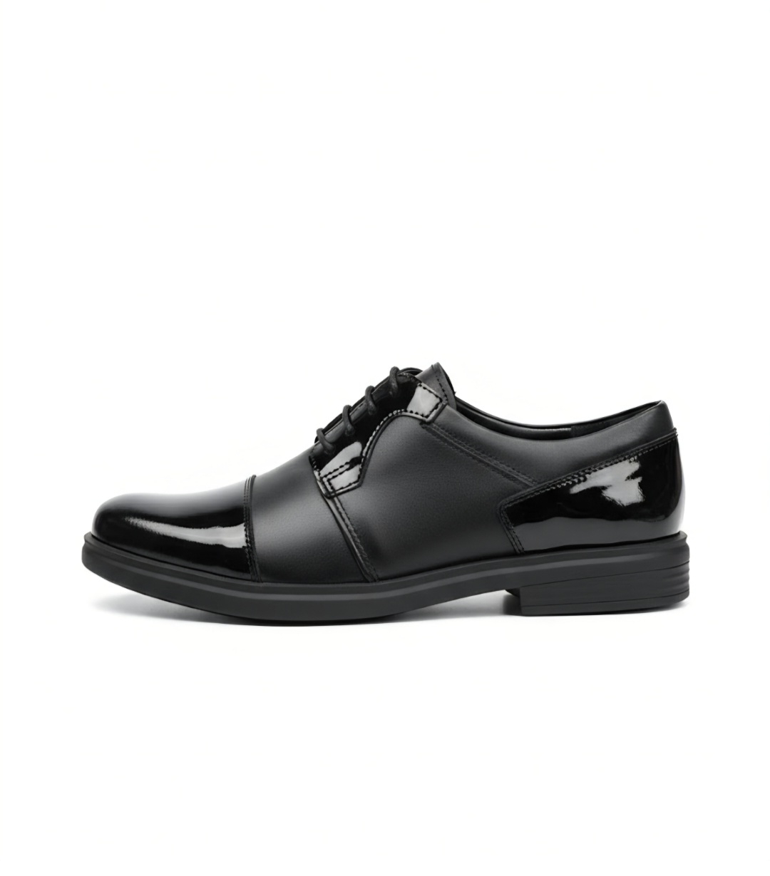 Piele Naturală Premium: Combinația inteligentă între pielea mată și inserțiile din piele lăcuită (în zona vârfului și a călcâiului) creează un contrast vizual sofisticat.