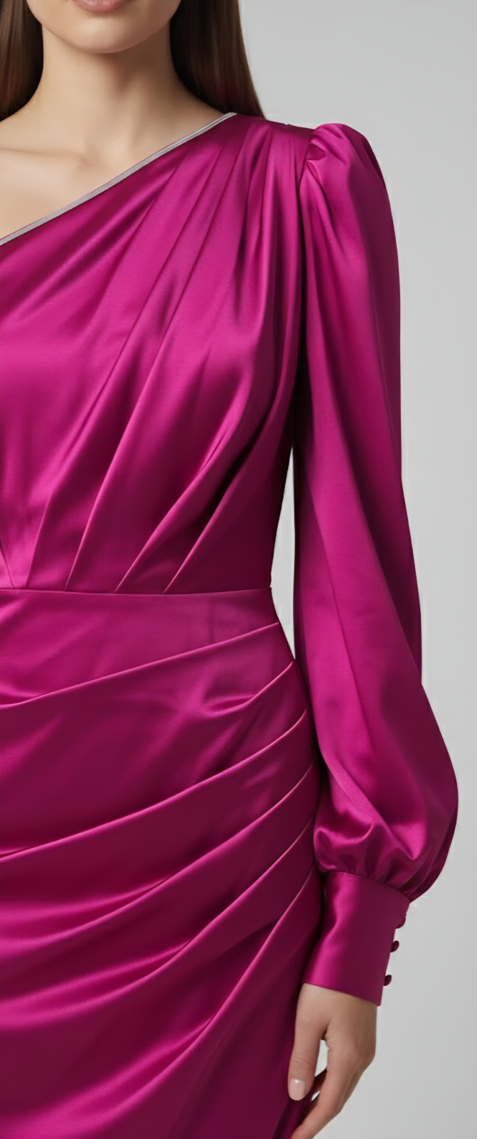 Drapaje Sculpturale: Partea frontală și laterală sunt lucrate cu drapaje fine care flatează silueta, oferind un efect de subțiere și un volum armonios.