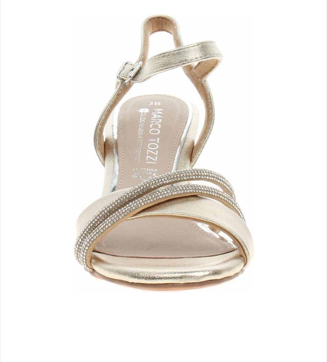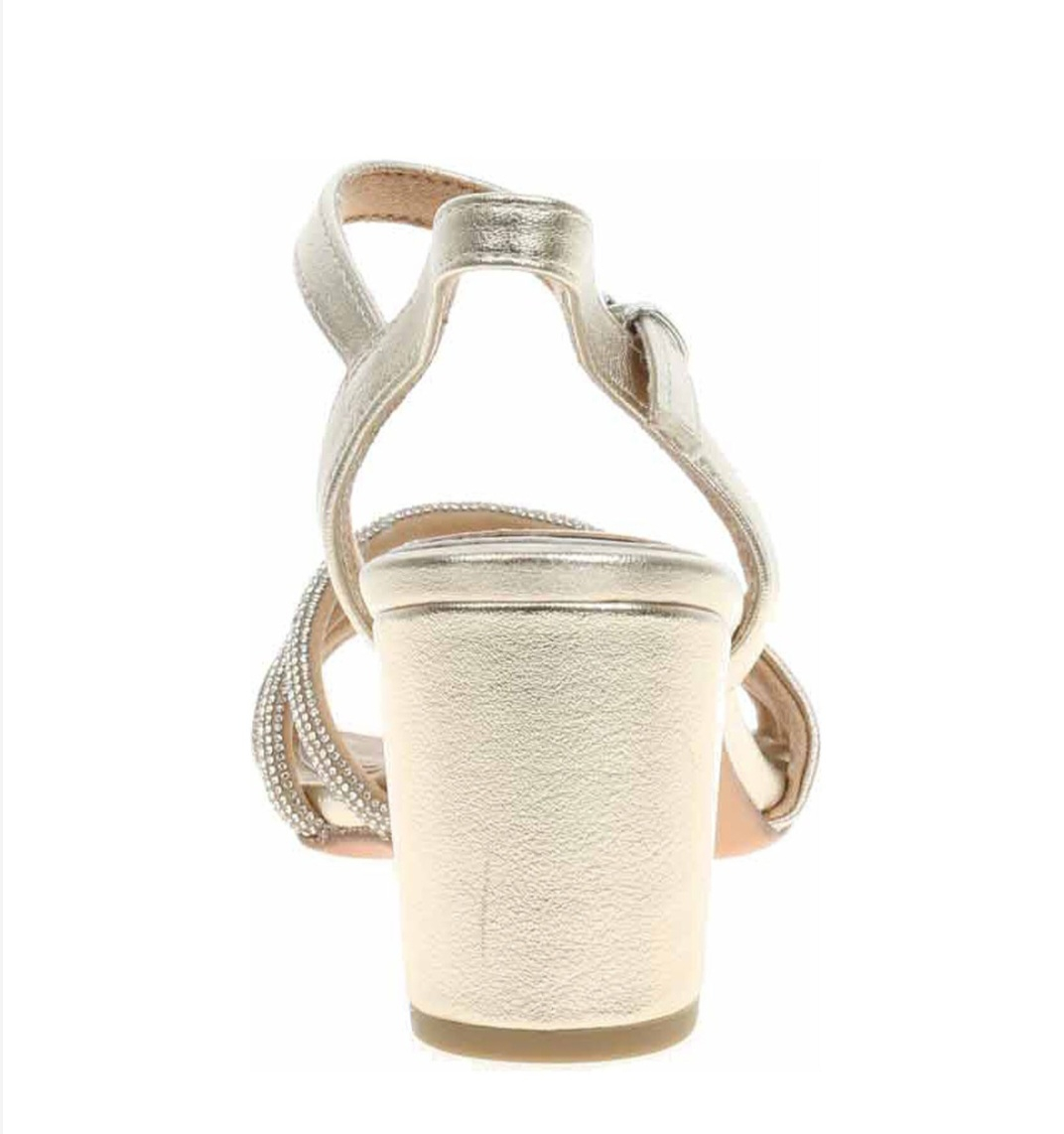 • Design Glamour: Baretele frontale sunt decorate cu inserții strălucitoare de cristale fine, oferind un contrast superb cu finisajul metalizat de culoare champagne.