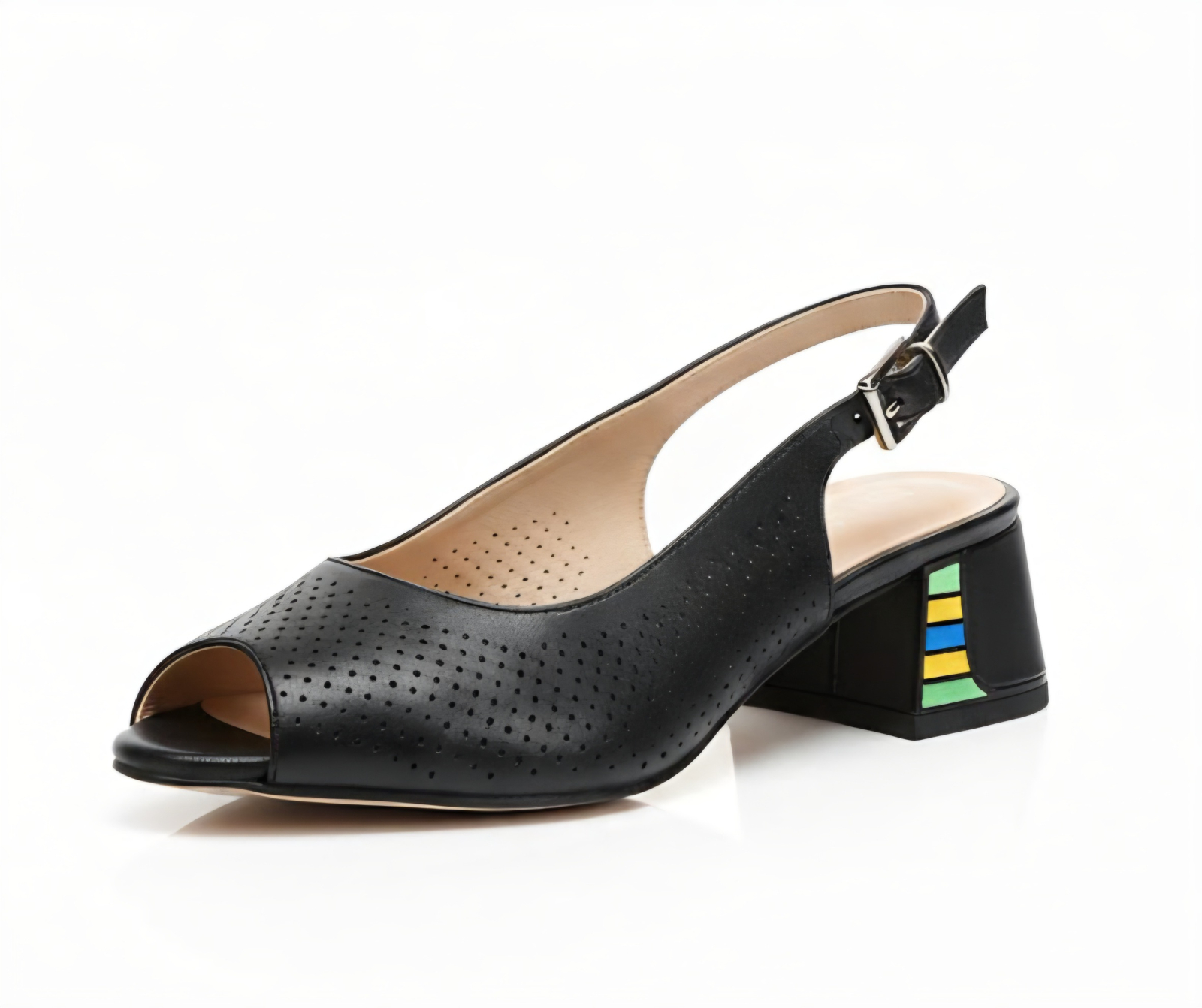 Toc Statement: Elementul surpriză este tocul stabil, de înălțime medie, decorat cu un insert geometric în nuanțe vibrante de verde, galben și albastru. Un detaliu subtil care scoate orice ținută din anonimat.