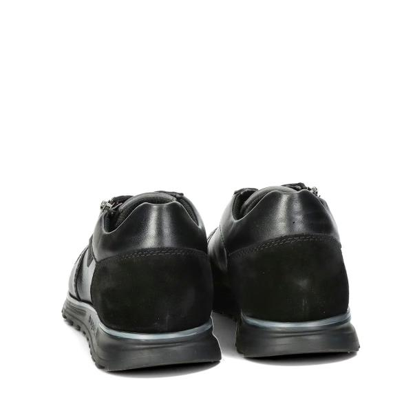 Designul este dominat de un joc subtil de texturi: pielea naturală netedă din partea frontală se îmbină armonios cu detaliile din piele întoarsă (suede) din zona călcâiului, oferind un look sofisticat, "all-black".